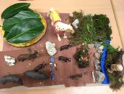 Das wird deutlich, als Kinder durch Zufall Höhlenmalereien dieser Menschen in den großen Ferien entdecken. Natürlich haben wir uns noch mit den Menschen der Jungsteinzeit befasst. Diese wurden sesshaft in Dorfgemeinschaften, hielten Tiere, begannen Felder mit einem Hakenpflug zu bestellen, legten Vorräte an, buken Brot, flochten Körbe, stellten Waffen her wie Pfeil & Bogen und Speere und lebten in selbst gebauten Häusern. Viele ihrer Techniken wenden wir auch heute noch an: Stoffe werden auch heute noch gewebt und Getreide gemahlen. Netze werden damals wie heute zum Fischfang verwendet. Messer und Äxte allerdings werden nicht mehr aus Stein hergestellt, sondern aus Metall. Um einen Eindruck von einem Jungsteinzeitdorf zu erhalten, fertigten wir im Unterricht ein Panoramabild an. Auf diesem konnte man Landschaft, Gebäude, Tiere und die Menschen bei ihren Tätigkeiten sehen.